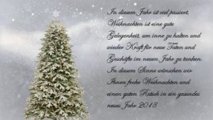 In diesem Jahr ist viel passiert, Weihnachten ist eine gute Gelegenheit, um inne zu halten und wieder Kraft für neue Taten und Geschäfte im neuen Jahr zu tanken. In diesem Sinne wünschen wir Ihnen frohe Weihnachten und einen guten Rutsch in ein gesundes neues Jahr 2018.